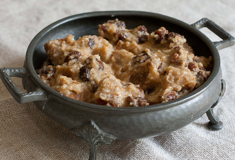 The pudding nosotros know today began life as a pottage. This was a kind of broth, including raisins and other dried fruit, spices and wine. Information technology was thickened with breadcrumbs or ground almonds. Not different to the mince pies of yesteryear, it often included meat or at least meat stock.